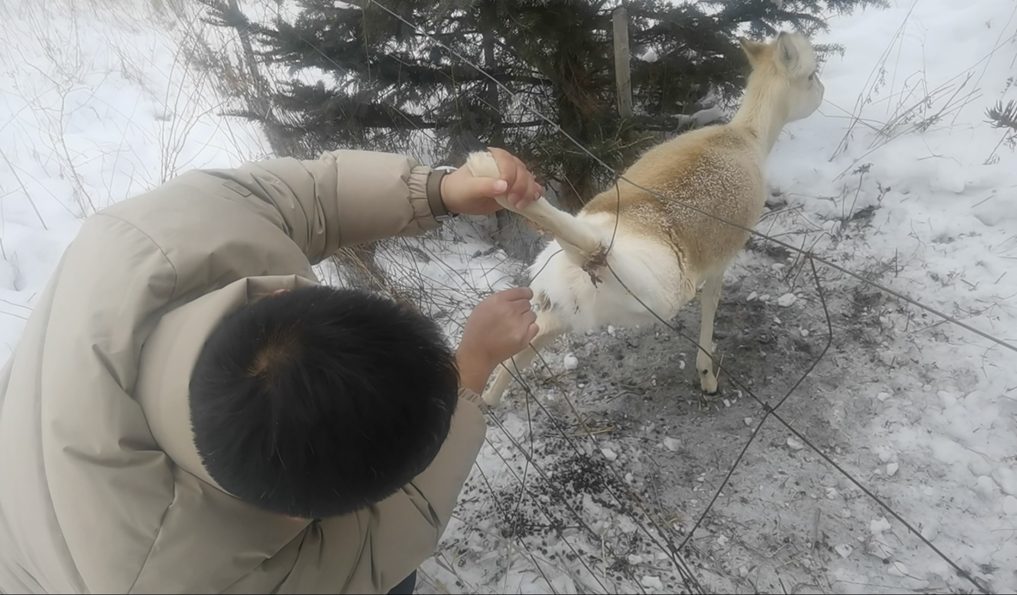 近日,阿爾山水發(fā)農(nóng)旅有限公司副總經(jīng)理吳洋、張帥帥在去口岸物流園區(qū)工作的途中,看見遠(yuǎn)處兩只狗蹲坐在地上,緊緊盯著前方,隨視線望去,發(fā)現(xiàn)中蒙邊境線隔離圍欄上掛著一只動(dòng)物在鐵絲網(wǎng)下不斷掙扎著,后腿被鐵絲緊緊纏繞,不斷滲血。他們趕緊跑了過去,發(fā)現(xiàn)竟是國家一級(jí)野生保護(hù)動(dòng)物黃羊。兩人立即對(duì)其進(jìn)行救助,經(jīng)過半個(gè)小時(shí)的努力,順利將黃羊后腿從鐵絲網(wǎng)上移出,待其行動(dòng)自如后放歸大自然,黃羊被放歸后轉(zhuǎn)身回望許久不愿離去,似在表達(dá)對(duì)于人類的感激之情。
