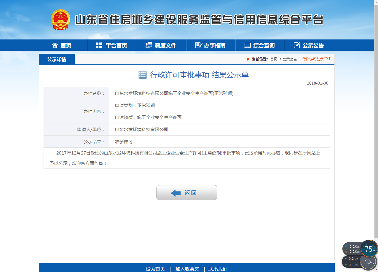 1月30日,山東省住房城鄉(xiāng)建設(shè)服務(wù)監(jiān)管與信用信息綜合平臺發(fā)布公示,山東水發(fā)環(huán)境科技有限公司成功獲得2018-2021年山東省施工企業(yè)安全生產(chǎn)許可,并于當(dāng)日進行公示。