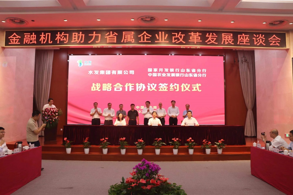 會上,國家開發銀行山東省分行、中國工商銀行山東省分行、中國建設銀行山東省分行、中國銀行山東省分行、中國農業銀行山東省分行、中信銀行濟南分行、恒豐銀行濟南分行、民生銀行濟南分行、渤海銀行濟南分行等銀行與水發集團簽署了金融機構銀團助力水發集團改革發展協議,國家開發銀行山東省分行、中國農業發展銀行山東省分行分別與水發集團簽署了戰略合作協議。